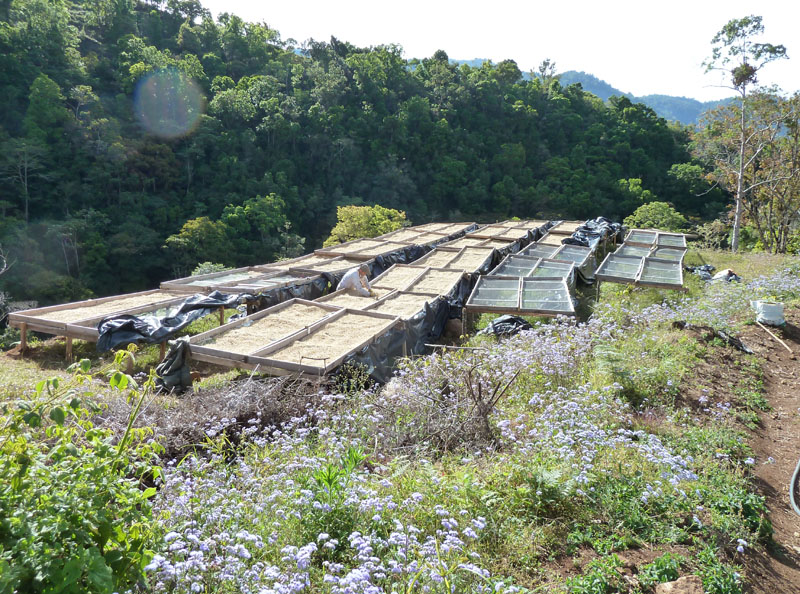 While large commercial processors will use a power unit, small operations use the sun. Beans are spread out to dry. Most spread the beans on a concrete pad; Matias uses drying racks called parijuelas, traditional wood-framed mesh racks.