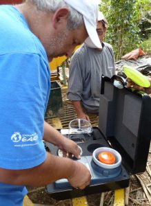 Every day, the moisture content of each parijuela is measured and logged. This is done with a moisture meter, in this case a Sinar FarmPro 6090. This unit can measure the moisture of green beans with and without parchment, as well as roasted coffee as whole bean or ground.