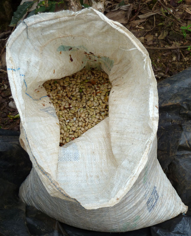 The equivalent of 10 cajuelas, half of a fanega, of cherries goes into the processor, and 4 cajeulas come out. This is poured into one parijuela. Once these dry and have their parchment removed, they will result in 54 pounds of green coffee. Each parijuela is labeled and the date is noted when a batch of fresh beans is added. The average drying time is seven days in the sun. In a labour intensive process, the wet beans must be moved around several times a day to avoid any rot or fungus growing. In the evening and during rain, the beans must be covered to avoid absorbing water. Two approaches are used here. In the picture above, black plastic sheets are connected to each Parijuela. This plastic is draped over the beans at night.